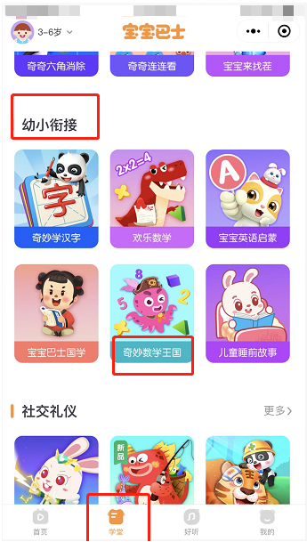 宝宝巴士微信小程序中的“学堂”板块和“幼小衔接”栏目