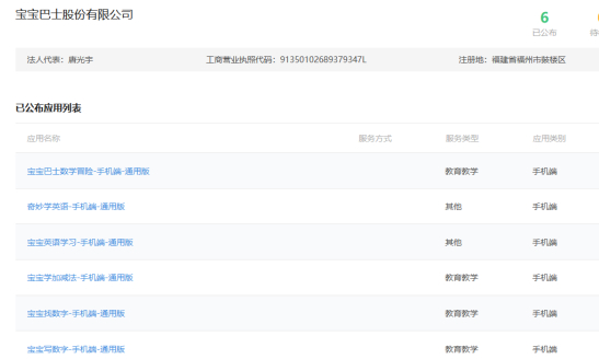 实际上宝宝巴士拥有教育类APP备案,记者目前查询到宝宝巴士备案的教育类APP仅有6款,这些APP均是涉及英语、数学等教育类型,比如“宝宝英语学习”、“宝宝巴士数学冒险”、“宝宝英语学习”、“宝宝学加减法”、“宝宝找数字”、“宝宝写数字”等等,其中多个教育APP的功能类型涉及到教育教学。