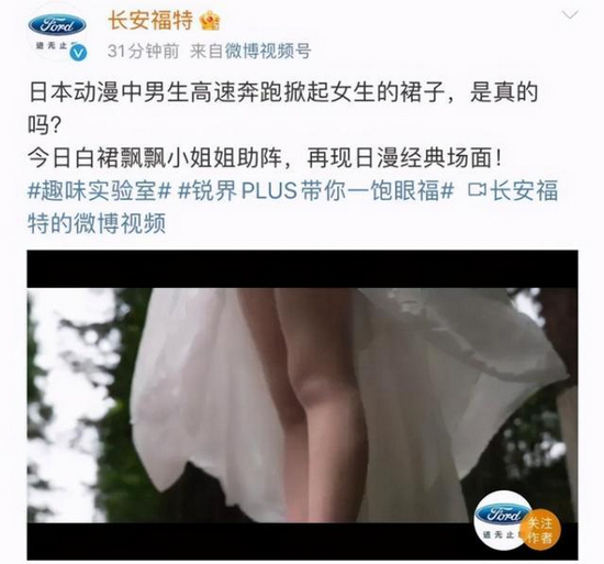 福特汽车为了展示旗下新车的速度优势,推出了一支速度测评视频广告,被网友认为以低俗营销赚取眼球。视频的封面配文“高速的奔跑能不能掀起女生的裙子?”,同时添加了“锐界PLUS带你一饱眼福”的话题标签,还有拍摄女生裙底的低俗画面。