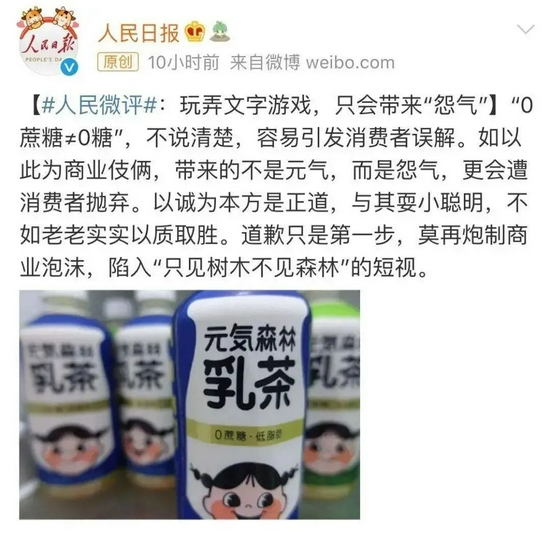 元气森林致歉称,在乳茶产品的宣传中,没有说明“0蔗糖”与“0糖”的区别,容易引发误解,将进行修正升级。随后新华社、人民日报相继评论:元气森林玩弄文字游戏,只会带来“怨气”。