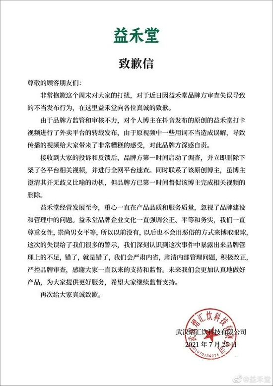 25日,益禾堂发布致歉信称,由于品牌方监管和审核不力,对个人博主在抖音发布的原创的益禾堂打卡视频进行了外卖平台的转载发布,由于原视频中一些用词不当造成误解,导致传播的视频给大家带来了非常糟糕的感受,对此品牌方深感自责。接收到大家的投诉和反馈后,品牌方第一时间启动了调查,并立即删除下架了各平台相关视频,并进行全网平台速查。