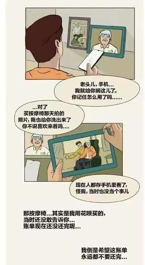今年花呗的一条广告,内容主要讲述了一位职场新人,用花呗分期为爷爷买按摩椅,在爷爷离开后,孙子还买了新手机给爷爷在下面用,并“希望这笔账单永远还不完。”