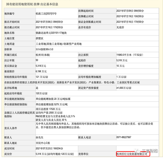 浙江省土地使用权网上交易系统显示,只有一条出价记录,7月15日杭州任行出价5318万。7月23日最终成交。