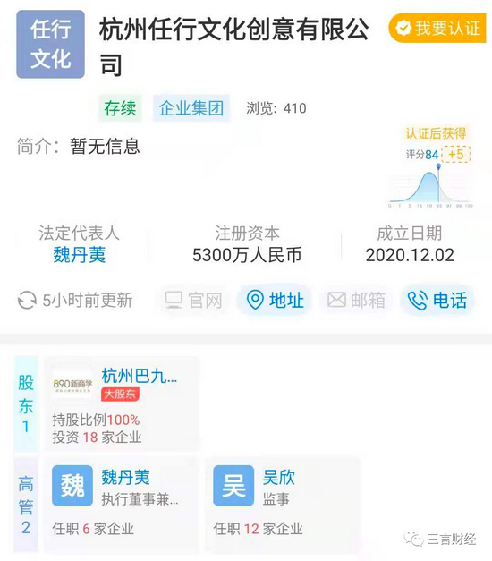 天眼查显示,杭州任行成立于2020年12月,注册资本5300万元,由杭州巴九灵文化创意股份有限公司100%控股。