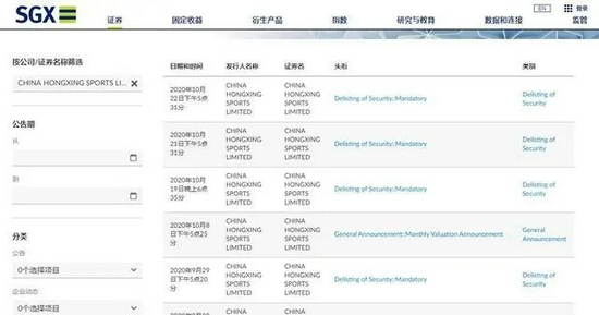 中新经纬客户端搜索新加坡交易所发现,鸿星尔克于2020年退市,最后一批公告发布于2020年10月份。在被强制退市后,新交所不再披露有关信息。