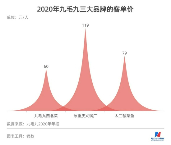 于是,在创立26年之后,九毛九急需一场突围,来驱动业绩的第三次增长,这个选择就落在了火锅身上。从最新披露的2020年财报来看,九毛九旗下的怂重庆火锅厂开业仅4个月,已经实现748.2万元的收入,客单价为119元,远超九毛九西北菜(60元)和太二酸菜鱼(79元)。