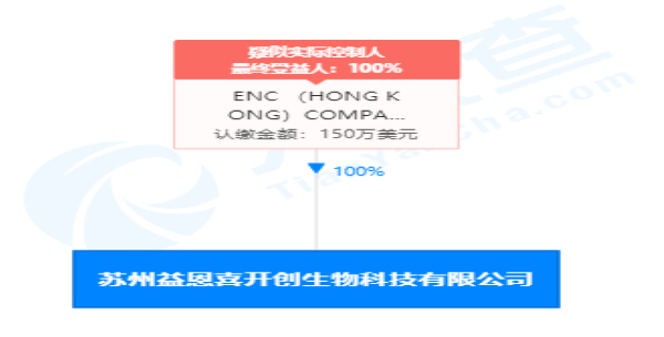 资料显示,苏州益恩喜开创生物科技有限公司成立于2019年02月19日,经营范围包括生物科技领域内的技术开发、技术咨询、技术服务等。刘雁为法定代表人、执行董事兼总经理,ENC (HONG KONG)COMPANY LIMITED为100%控股的大股东。