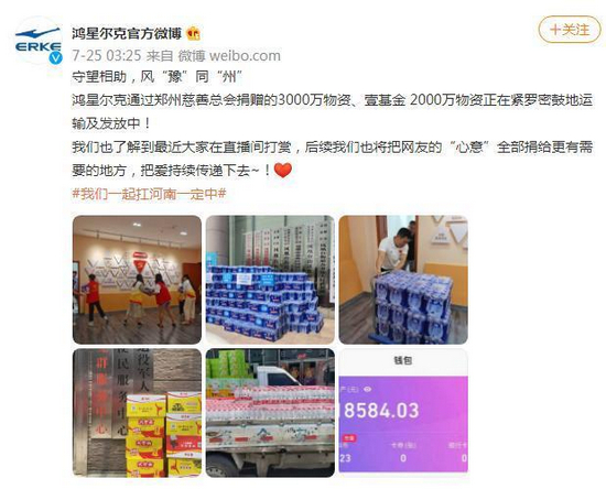 为了回应大众的质疑,7月25日凌晨3点25分,鸿星尔克通过官方微博公布了其捐赠物资的信息:“鸿星尔克通过郑州慈善总会捐赠的3000万物资、壹基金 2000万物资正在紧锣密鼓地运输及发放中!”