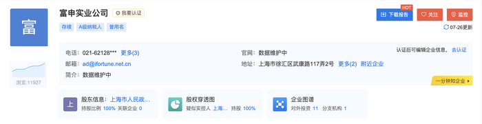 据天眼查信息,富申实业为全民所有制企业,曾有6家控股子公司和5家参股公司,目前11家企业均为吊销或注销状态。而据启信宝网站显示,富申实业的股东为上海市人民政府第五办公室。