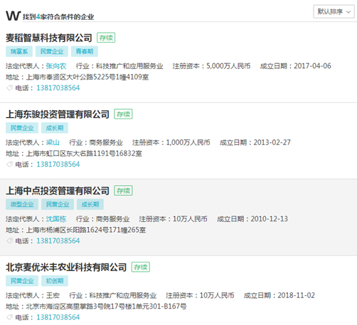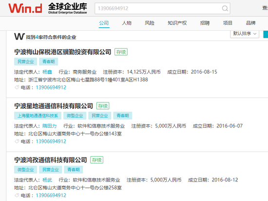 第五大股东上海东骏投资管理有限公司,由自然人梁山100%持有。该公司持有电气通讯8.5%股权。有意思的是,交叉对比Wind企业数据库的相关信息,可以发现,东骏投资注册时使用的手机号码,同时用于注册4家不同公司,其中两家为投资公司,两家为商业服务类,而它们表面上看起来从股东到法定代表人并无关联。这种情况,通常出现在批量注册皮包公司,以达到特殊目的之时(图1)。