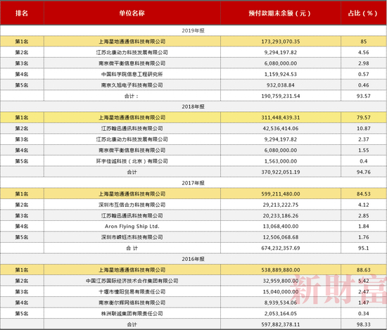 2016-2019年间,上海星地通都位列*ST华讯预付款第一名,各年度预付款余额分别高达5.39亿、5.99亿、3.11亿、1.73亿元,基本占*ST华讯对外预付款的8-9成(表3)。也就是说,上海星地通是*ST华讯的重要供应商。