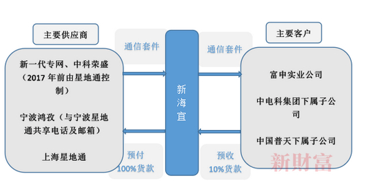 对于隋田力一方,能够以上市公司为中介,通过供应链套利国企。而且,通过上下游合作,也可以从上市公司套现金流出来,如在ST新海一案中,在2017年,为了销售10645套通信套件,ST新海向上游供应商预付3.68亿元,而下游客户只预收了0.48亿元,中间有着3.2亿元的差额。