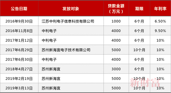 梳理海高通信历年公告可见,2016-2019年间,其曾多次向江苏中利电子(中利集团子公司)、苏州新海宜(现更名为苏州赛安电子技术有限公司,为ST新海孙公司)两家公司“放贷”,仅2019年,其就借给苏州新海宜合计1亿元,年利率10%。据新财富统计,这些贷款可给海高通信合计贡献2000万元放贷收益(表2)。