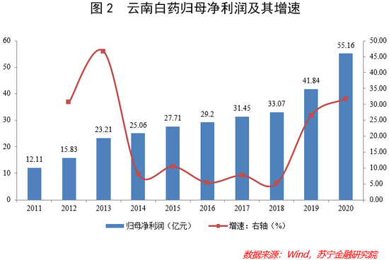 云南白药的业绩可以说是非常亮眼的。2011~2020年间,云南白药的营收由113.1亿元增至327.43亿元,年均复合增速为12.5%;归母净利润由12.11亿元增至55.16亿元,年均复合增速为18.3%(见下图)。有意思的是,2020年云南白药的业绩仍然保持了较快的增长,说明新冠疫情并未给公司的经营造成太大的影响。