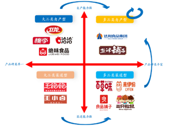 多品类自产型,此类公司通常具备多品类的自产能力,实现了多品类和多品牌的布局,以“盐津铺子”和“达利食品”为代表;