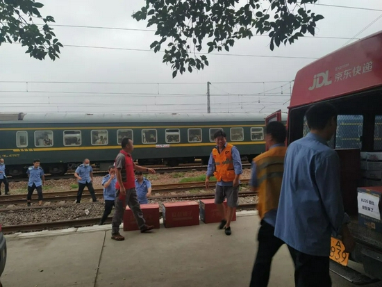 满载540多箱食品和矿泉水的京东物流车抵达K226/7次列车临时停靠的郑州铁炉站。