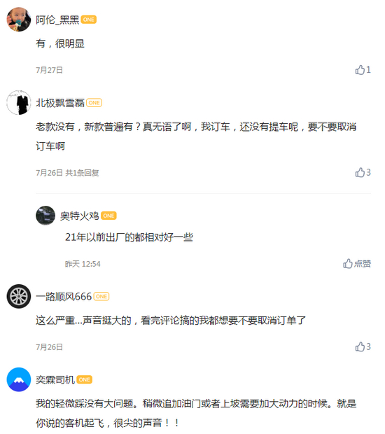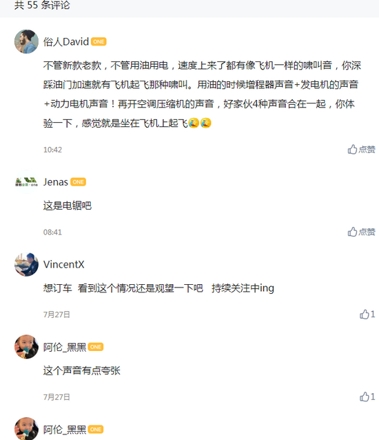 不少的理想车主纷纷留言表达自己的看法。有网友留言称“不管新款老款,不管用油用电,速度上来了都有像飞机一样的啸叫音,你深踩油门加速就有飞机起飞那种啸叫。用油的时候增程器声音+发电机的声音+动力电机声音!再开空调压缩机的声音,好家伙4种声音合在一起,你体验一下,感觉就是坐在飞机上起飞”。也有车主评论称“我的轻微踩没有大问题。稍微追加油门或者上坡需要加大动力的时候。就是你说的客机起飞,很尖的声音!” 还有不少理想ONE的意向车主表示“这么严重…声音挺大的,看完评论搞的我都想要不要取消订单了。”
