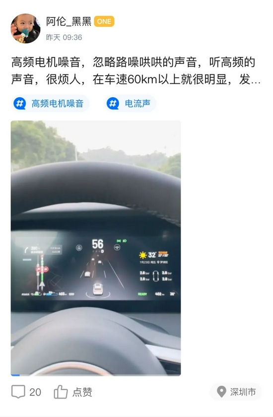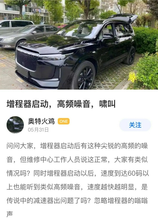 我们注意到,实际上该问题早前就有车主反馈。另一位理想ONE车主于5月31日发布视频提问:问问大家,增程器启动后有这种尖锐的高频的噪音,但维修中心工作人员说这正常,大家有类似情况吗?同时增程器启动以后,速度到达60码以上也能听到类似高频噪音,速度越快越明显,是传说中的减速器出问题了吗?忽略增程器的嗡嗡声。