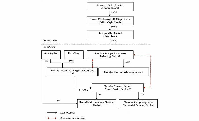 萨摩耶数科的全资股东萨摩耶信息成立于2018年3月,正值原萨摩耶金服赴美上市之年。招股书显示,香港主体Samoyed (HK) Limited(下称 “Samoyed HK”)全资控股萨摩耶信息,萨摩耶信息与原萨摩耶金服之间存在合约关系,萨摩耶信息作为VIE架构中外商独资的协议股东存在。