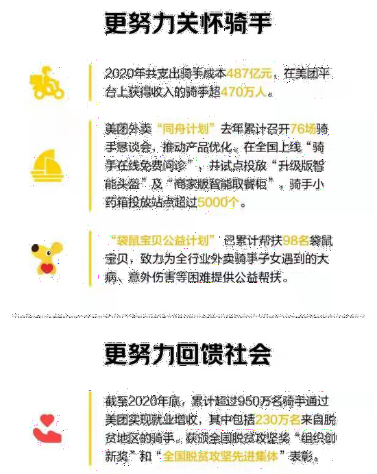 尽管未向数以百万计的骑手提供太多保障,但美团仍在各项报告中提及骑手,并以此标榜自己为社会所做的贡献。