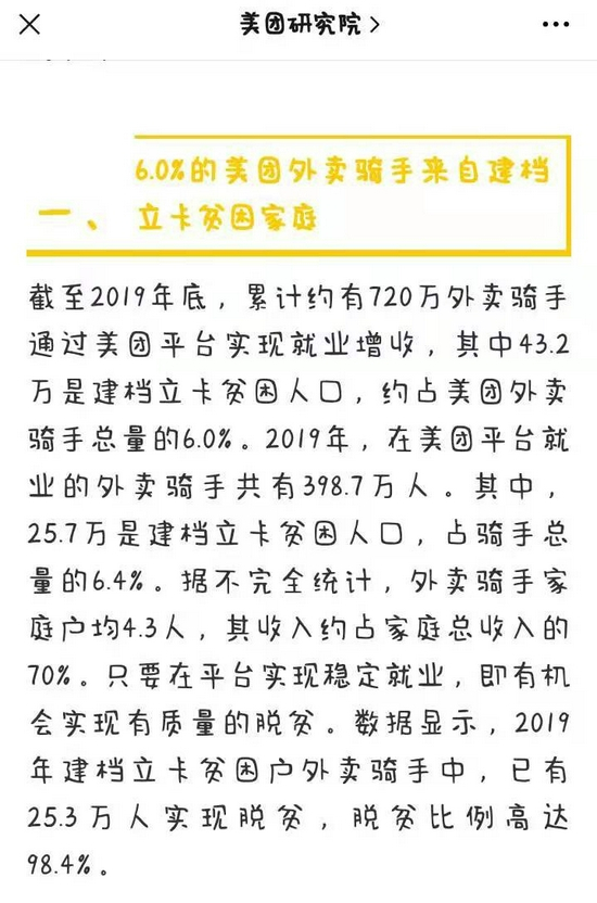 美团在2020年财报中提到,“截至2020年底,累计超过950万名骑手通过美团实现就业增收”。