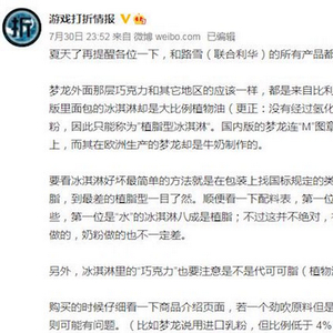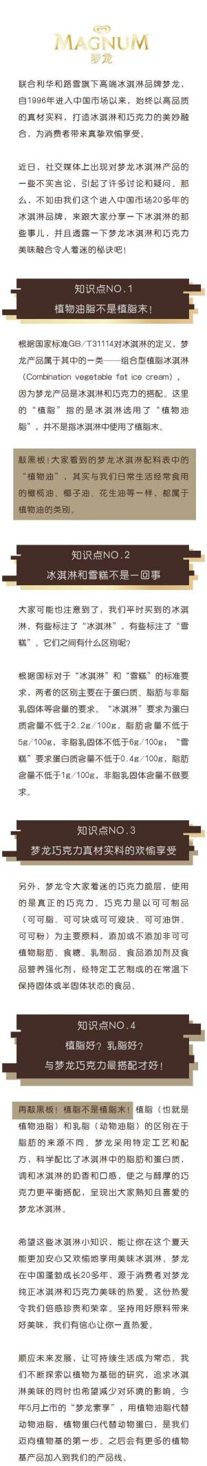 对此,梦龙公司也迅速做出回应,承认国内版冰淇淋中使用了“植物油脂”,同时还提到今年五月上市的“梦龙素享”,用植物油脂代替动物油脂。但是目前,梦龙官方微博已经将此回应删除。