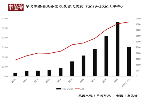 余承东自然居功至伟。从2010年至2019年,在他执掌下,华为消费者业务营收由2010年的309亿元增长至4673亿,增长超过15倍。2020年上半年,华为营收4540亿元,同比增长13.1%,其中消费者业务收入为2558亿,营收占比高达56.3%。