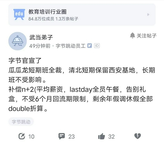 8月5日凌晨,一位脉脉认证为“字节跳动员工”匿名发帖称,今日上午,瓜瓜龙将开全员会,正式宣布裁员消息,低转正团队将被全员裁撤。中午时分,另一字节跳动员工在脉脉匿名区透露了这场会议的主要内容:瓜瓜龙短期班全员被裁,清北网校短期班保留西安基地,长期班不受影响,“Last day全员午餐,告别礼盒,N+2补偿,不受6个月回流期限制,剩余年假调休假全部double折算。”