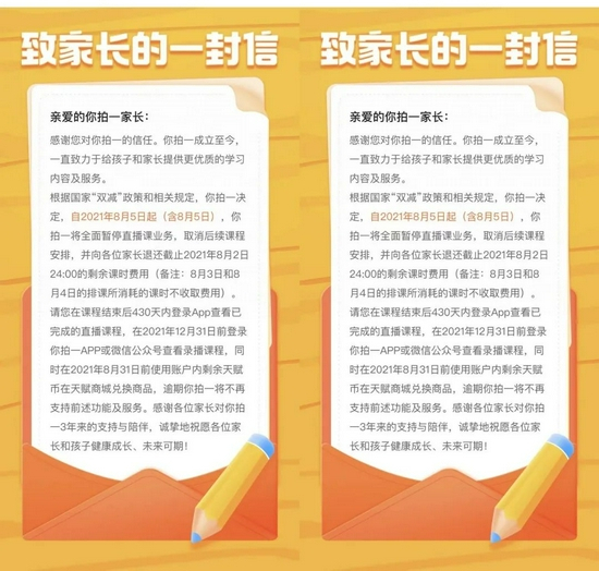 字节教育的其他业务也受到了类似限制,比如向3 - 12岁孩子提供思维动画课程的你拍一以及主打在线一对一少儿英语培训的GOGOKID。今日,不少家长收到了你拍一和GOGOKID发出的致家长一封信,信中称“根据国家‘双减’政策和相关规定,你拍一决定自2021年8月5日起(含8月5日)全面暂停直播课业务,取消后续课程安排”。