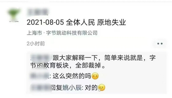 一张流传甚广的截图显示,字节跳动教育板块将被全部裁掉,“全体人民,原地失业。”