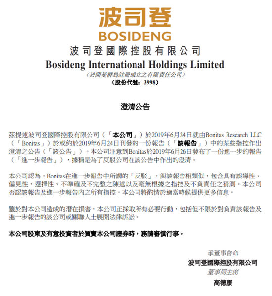 针对博力达思的第二份做空报告,波司登回应媒体表示,公司对所有指控都否认,该报告包含具有误导性、偏见性、选择性、不准确及不完整之陈述以及毫无根据之指控及不负责任之猜测。且不排除启动法律诉讼程序追究。愤怒之情溢于言表。