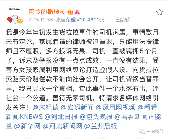 7月15日,认证是涉事货拉拉司机周某春家属的用户在社交平台上发文称,“货拉拉跳车事件”受害方家属利用网络舆论打造虚假人设, 向货拉拉索赔天价赔偿且不能向社会公开;涉事司机周某春成了替罪羊,司机家属希望得到公平对待;