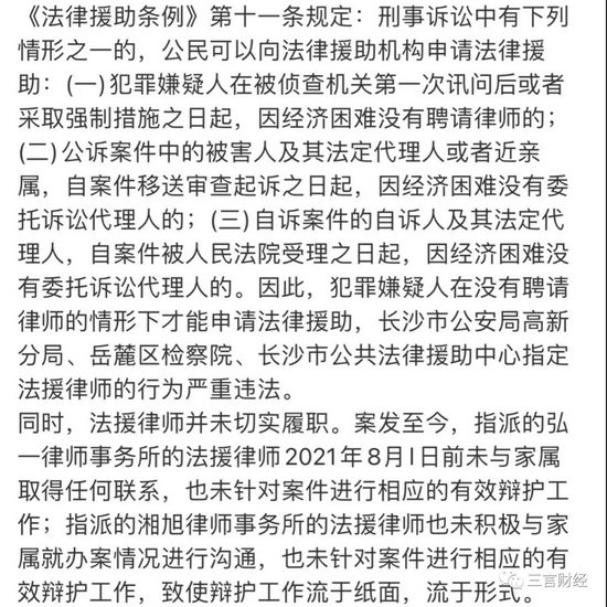 文章称,即使如此,法律援助律师也并未切实履行职责。指派的某律师事务所的法援律师在8月1日前未与家属取得任何联系;也没有针对案件进行有效的辩护工作;而指派的另一家律师事务所的法援律师也没有积极与家属沟通,并且未针对案件进行有效辩护工作。