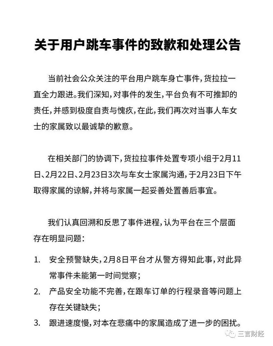 2月24日,货拉拉再发声明称,经过多日与受害方车某家属沟通,已于2月23日取得家属谅解。此外,货拉拉表示,公司对此事安全预警不足且跟进速度慢,而App产品功能不完善。对于用户跳车致死事件,平台负有不可推卸的责任,并感到极度自责与愧疚。