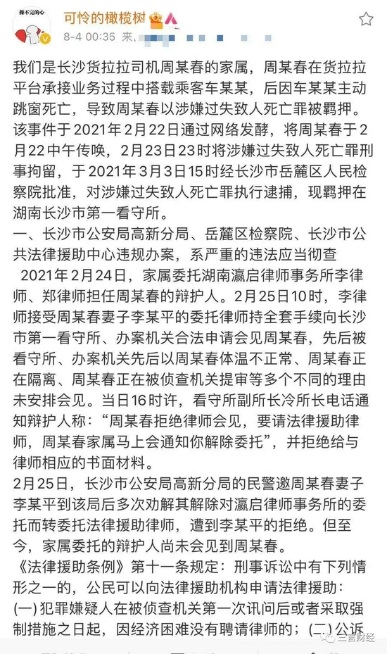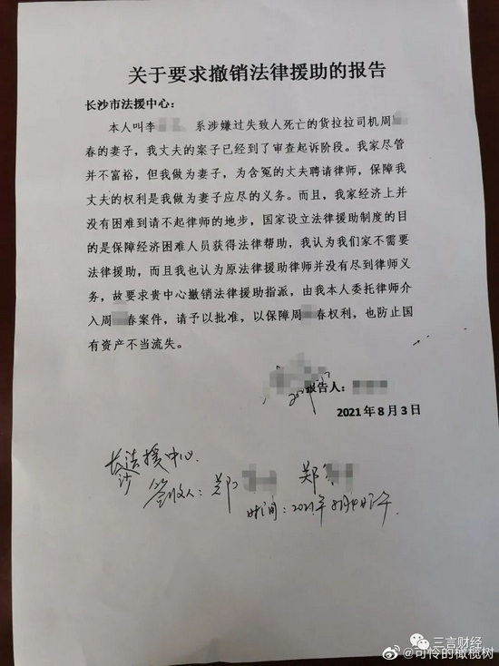 8月5日,周某春家属在微博上晒出了一份《关于要求撤销法律援助的报告》。周某春妻子在报告中称,自己家庭虽然不富裕,但还没有困难到请不起律师的地步。因此不需要法律援助,且目前法律援助律师未尽到律师义务。