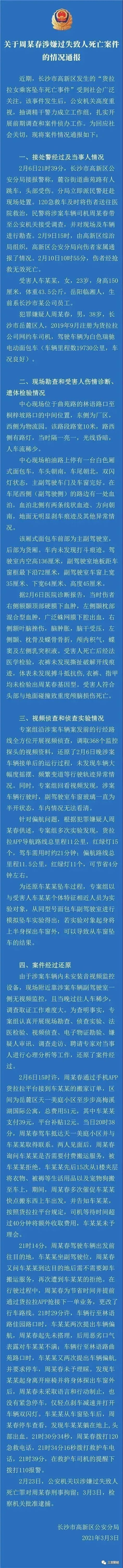 2021年3月3日,长沙市公安局高新区分局发布了“跳车事件”对情况通报。根据通报,检察机关对周某春已批准逮捕。调查显示行车过程中,二人未有肢体冲突,也没有发生侵害女生的行为。