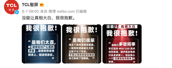 8月2日,距离山东省高院的判决已经过了10天,TCL仍然没有任何动作,海信忙着向青岛市中院申请强制执行的时候。8月7日上午,既不赔偿也不道歉的TCL在自己的微博里发布了一条“没能让真相大白,我很抱歉”的公关微博,并配发三张图片。