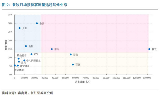 从长江证券研究所研报中,关于餐饮月均接待客流量远超其他业态来看,餐饮行业的月客流量远超其他。相比商场中杂货、儿童、电玩、百货、影院、家具、珠宝、数码等业态,餐饮作为高频次消费、相对低客单价的业态,可吸引更多人进入商场。
