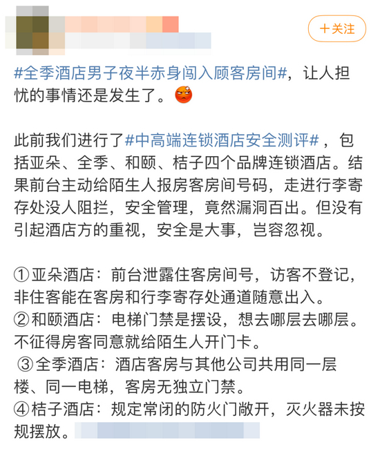 今年7月,有博主曾以卫生、安全等为重要维度对亚朵、全季、和颐、桔子等连锁酒店进行了测评,但观察结果令人堪忧。这些中高端的酒店存在着前台轻易泄露住客房间号,访客不登记信息,客房无独立门禁,前台未征得房客同意或未核验房客身份就给陌生人开门卡等问题。不禁让人质疑:“如此松散的管理,拿什么保障客户的人身财产安全?”