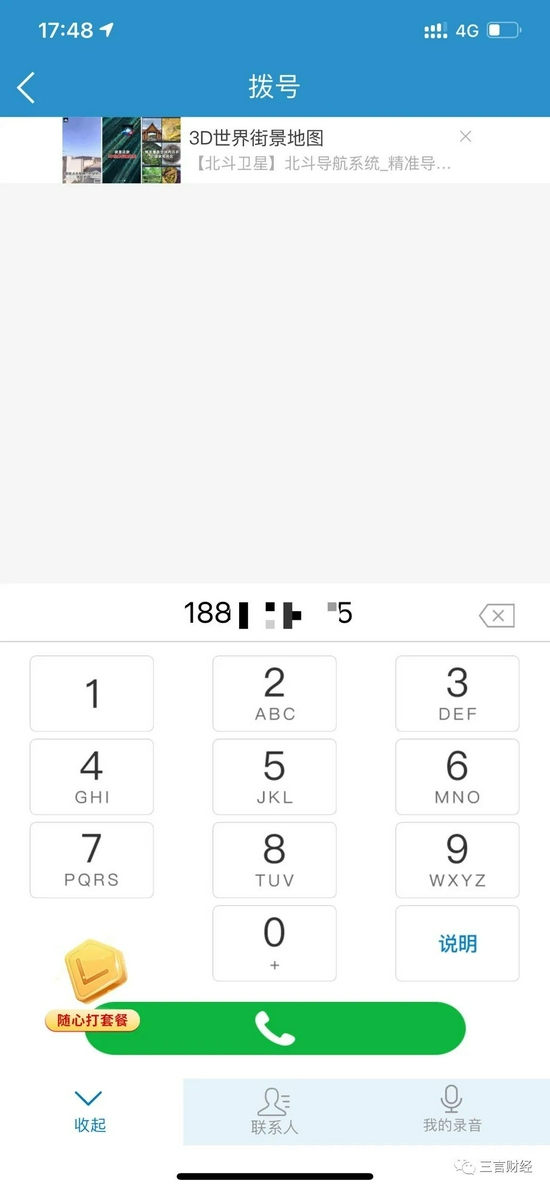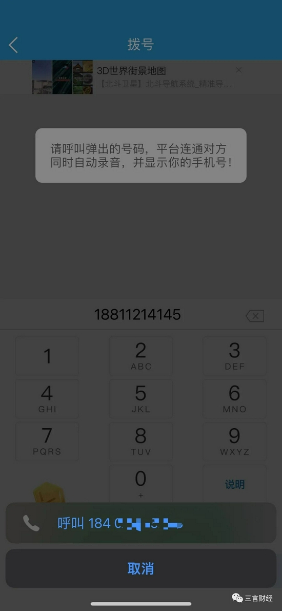 三言财经选择了用充值方式提供通话录音的App体验。充好值后,进入软件内的电话录音入口拨打电话即可。