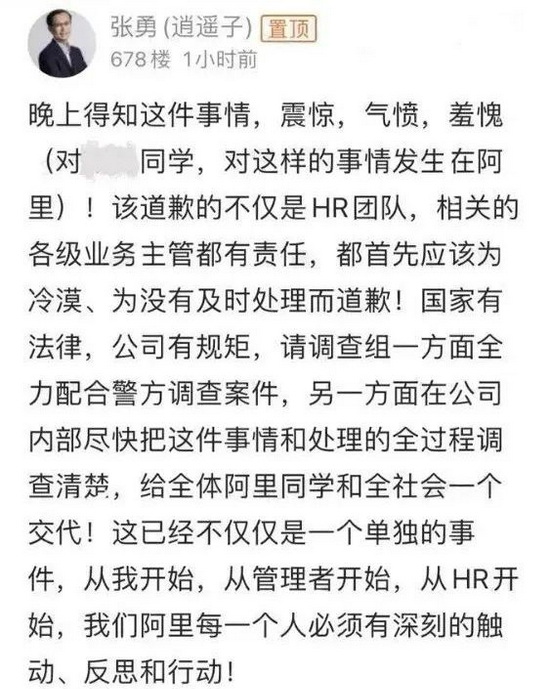 8号凌晨——也就是距离性侵事件发生近半个月后,阿里现任掌门张勇表态,前一晚才得知这件事情,感到“震惊、羞愧、气愤”。