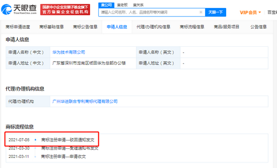 天眼查App显示,近日,华为技术有限公司申请注册的“P100”商标流程信息变更为驳回通知发文,相关商标申请日期为2021年3月,国际分类涉及科学仪器、运输工具。
