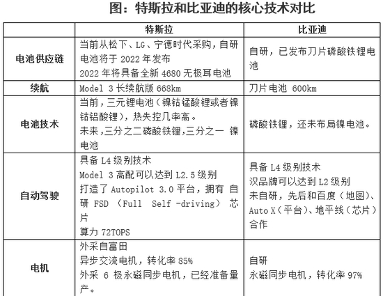 下面对特斯拉和比亚迪进行了全面的对比,软件层面,特斯拉的V10、Autopilot3等完胜比亚迪刚推出的BYDOS和Dipilot,硬件层面,比亚迪的自研刀片电池、自研电控SiCMOFET、自研永磁同步电机要优于特斯拉使用的硬件。特斯拉在2020年9月公布了将于2022年上市的“无极耳电池”,将是无钴、纯镍、生硅阳极电池,将提升特斯拉里程达54%,每kWh(千瓦时)费用降低56%,能否实现将拭目以待,将对整个电动汽车行业影响深远。