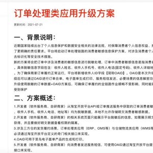7月21日,淘宝更新“订单敏感信息保护”的应用升级方案,包括“订单处理类”和“仓储物流类”,称将启动订单处理链路的消费者敏感信息保护方案,对涉及消费者个人敏感信息采取加密等安全技术措施。