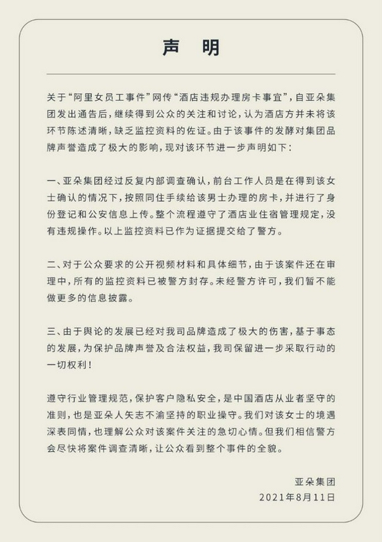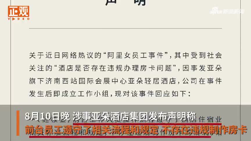 8月10日晚,亚朵集团在其官方微博回应称,经核查,前台工作人员操作流程遵守了酒店住宿业相关标准流程和规定,不存在违规办理房卡的情况。相关音视频资料已提交警方。