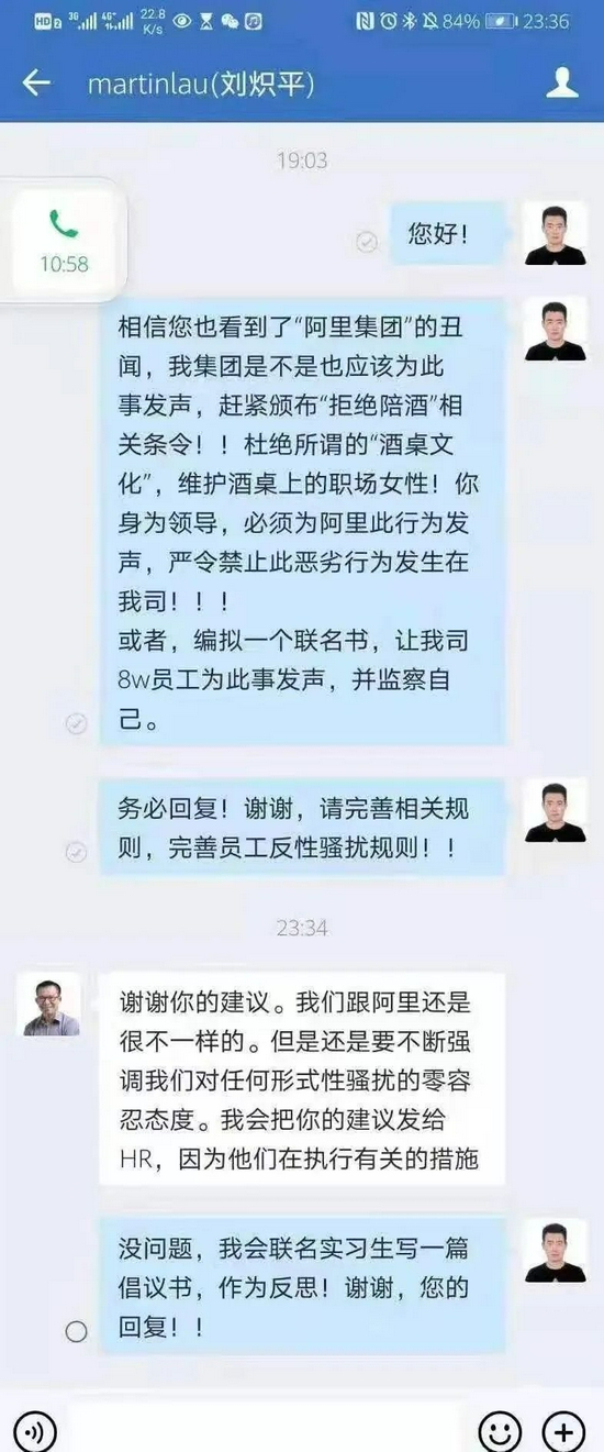 一是,一位腾讯实习生分别向马化腾和刘炽平提要求了:“赶紧颁布‘拒绝陪酒’相关条令,杜绝所谓的‘酒桌文化’,维护酒桌上的职场女性,你身为领导,必须为此行为发声,严令禁止此恶劣行为发生在我司。”