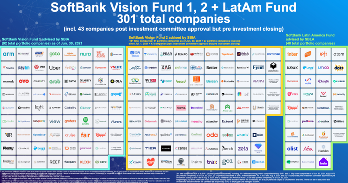 从数量来看,软银及愿景基金在全球共布局了301家公司。具体来看,截至6月30日,愿景1号持有82项投资,投资金额超740亿美元,其中15家公司已上市,本季度新上市公司4家。