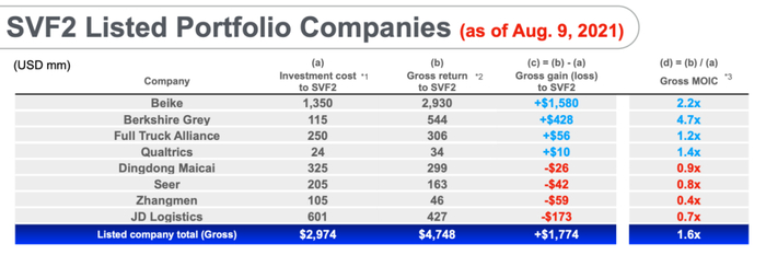 不过愿景基金2号持有的贝壳、叮咚买菜、掌门教育和京东物流目前均为退出,截至8月9号,受资本市场波动影响,股价下滑,影响了愿景基金整体的收益情况。