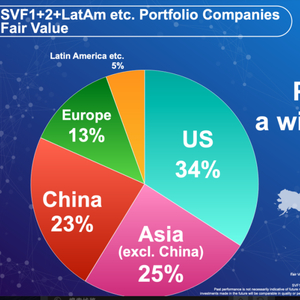 据孙正义演讲显示,截至6月底,软银在全球共投资301家公司,阿里巴巴仍是软银持有市值最大的一笔投资,占39%。从地区来看,软银愿景基金在全球的投资主要集中在美国、亚洲、欧洲和拉丁美洲地区。其中,中国投资占比23%。