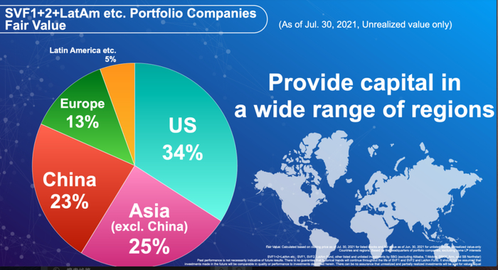 从地区来看,孙正义表示投资日显均衡,截至2021年6月底,软银愿景基金在中国的投资占比为23%,相比以往有所减少,美国依然是愿景基金投资占比最大的地区,达34%。